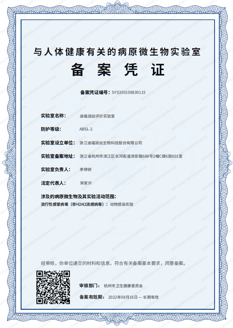 浙江省病原微生物实验室备案证书
