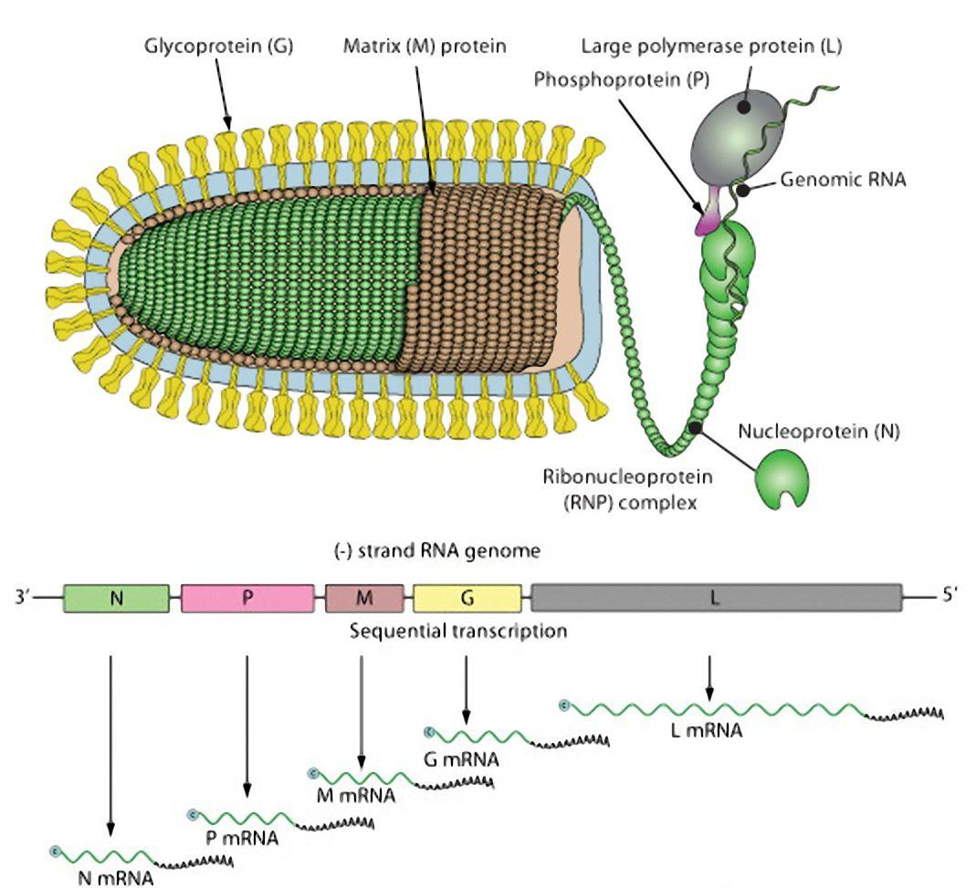 野生型的VSV是一种由包膜病毒,其病毒体结构呈弹状或杆状,拥有一条单链负义RNA基因组(-ssRNA),并且其复制依赖病毒的RNA聚合酶(RNA-dependent RNA polymerase,RdRp)。含有5种结构蛋白:核蛋白(N),磷酸化蛋白质(P),RNA聚合酶(L),基质蛋白(M)以及糖蛋白(G)。