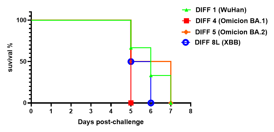 图3.疫苗鼻腔免疫小鼠后滴鼻途径感染VSV新冠假病毒后存活率