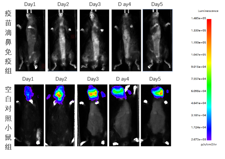 图2.疫苗鼻腔免疫后滴鼻途径感染VSV新冠假病毒活体成像